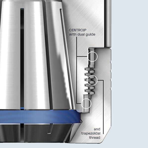 The CENTRO|P is designed to offer the largest possible tool passage and therefore provides an extra-long length adjustment range. This allows the tool to be clamped at the optimal overhang length, preventing vibrations, protecting the tool and optimising the surface finish.